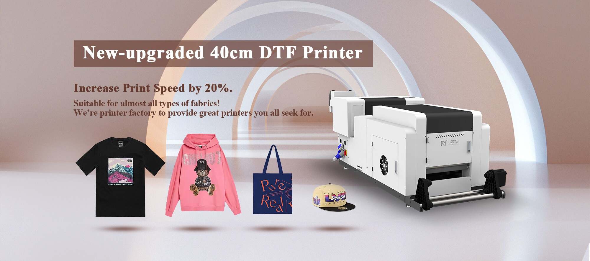Our MTuTech latest DTF Printers (Direct to Film Printers) works for all fabric, perfect option for custom apparel printing. You can expand your inventory by applying your designs to a whole variety of merchandise with DTF. With the advancement in DTF technology, there is no denying that DTF is taking the printing industry by storm. It is quickly becoming one of the most popular technologies for textile printing compared to traditional printing methods.