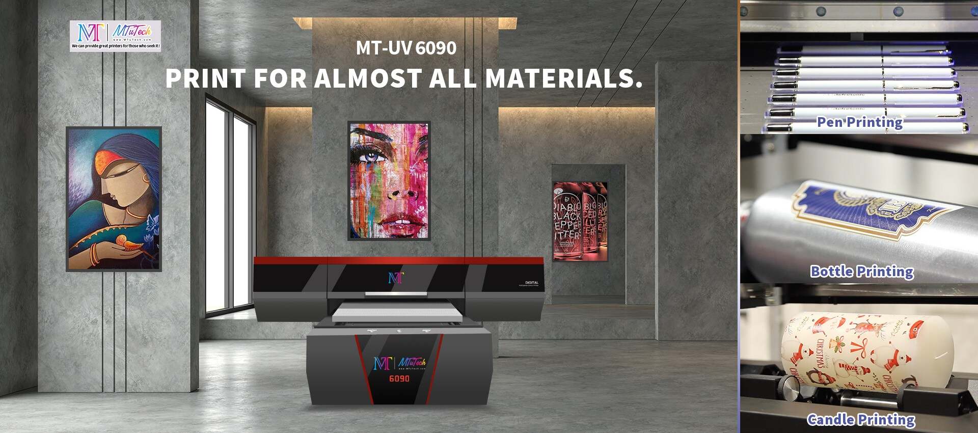 The MT-UV 6090 is adequate for printing on flat, tapered, or rounded surfaces. It is effective for printing on items with flat surfaces like phone cases, purses, puzzle pieces, pens, USB drivers and so on, as well as tapered and cylinder items like bottles, tumblers, golf balls, candle, etc.