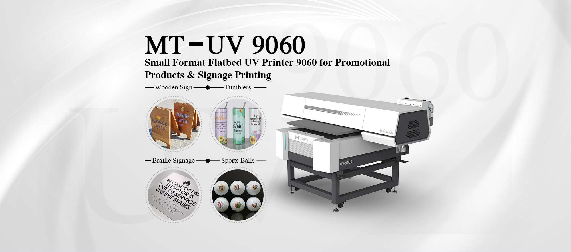 The MT-UV 9060 is adequate for printing on flat and cylindrical surfaces. It is effective for printing on items with flat surfaces like phone cases, purses, puzzle pieces, pens, USB drivers and so on, as well as tapered and cylinder items like bottles, tumblers, golf balls, candle, etc.
