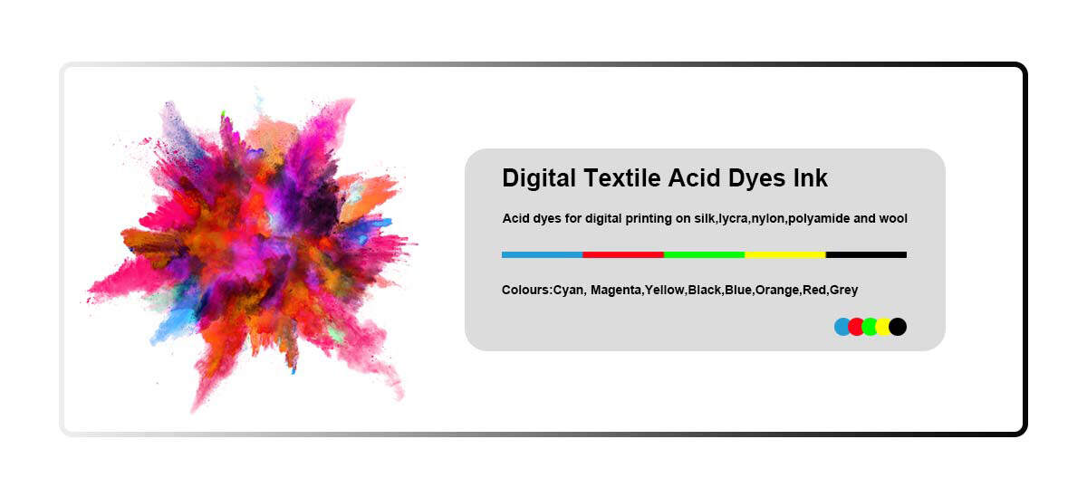 Acid dyes for digital inkjet printing on silk, lycra, nylon, polyamide and wool.