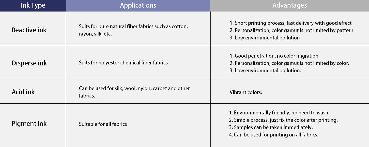 | Ink | Type | Sublimation Ink, Reactive Ink, Pigment Ink, Acid Ink |