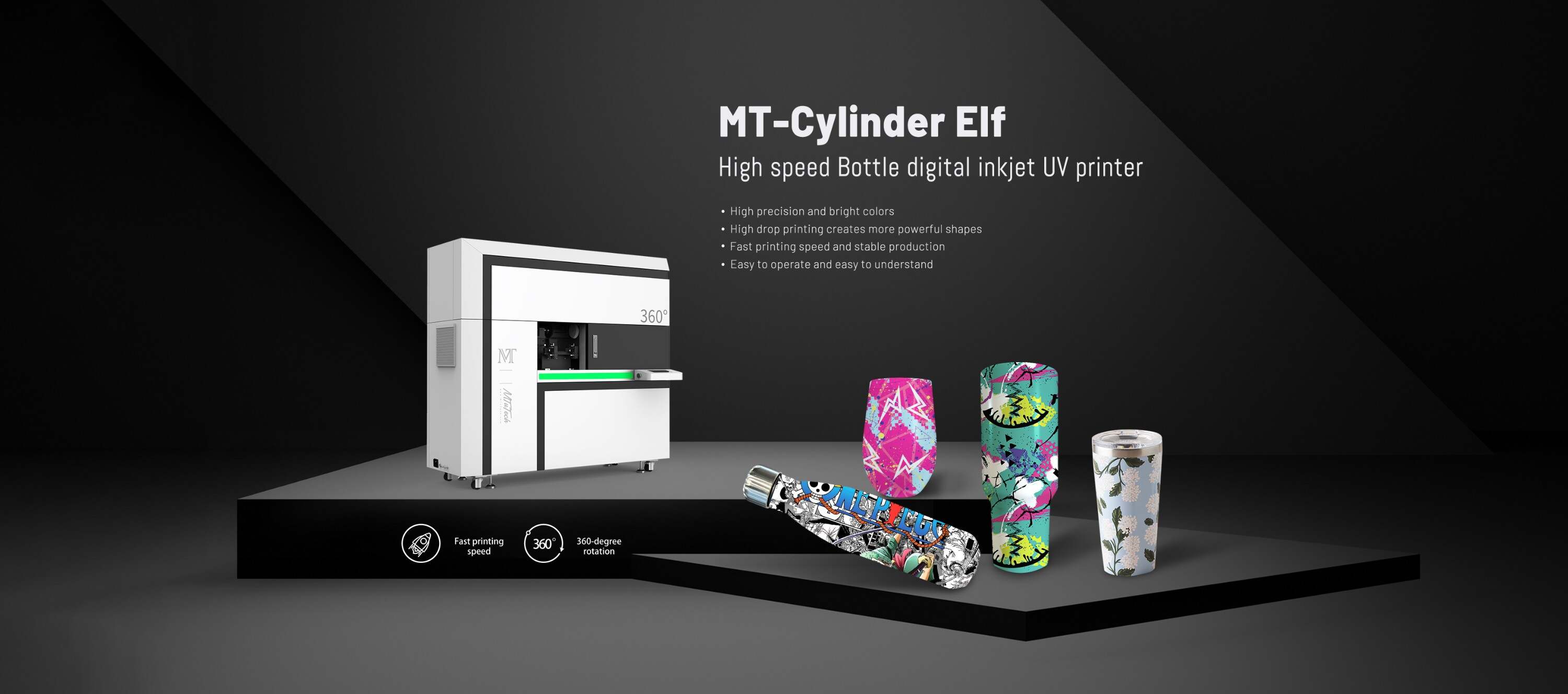 Our new arrival MT-Cylinder Elf is a custom high-speed 360 rotary UV printer that can print a wide range of drinkware items like tumblers, vacuum flask, glassware, and cups. It's designed specifically for direct printing on cylindrical surfaces as well as irregular tapered /conical objects. What makes it different from traditional UV bottle printer is fast speed capability, 5D relief printing effect, high droplet printing, suited for printing tapered & conical drinkware, and offers full 360º seamless wrap printing for various bottle objects.