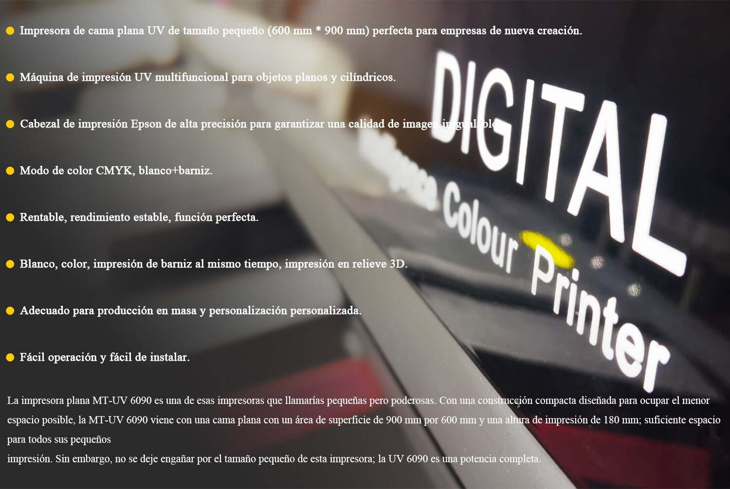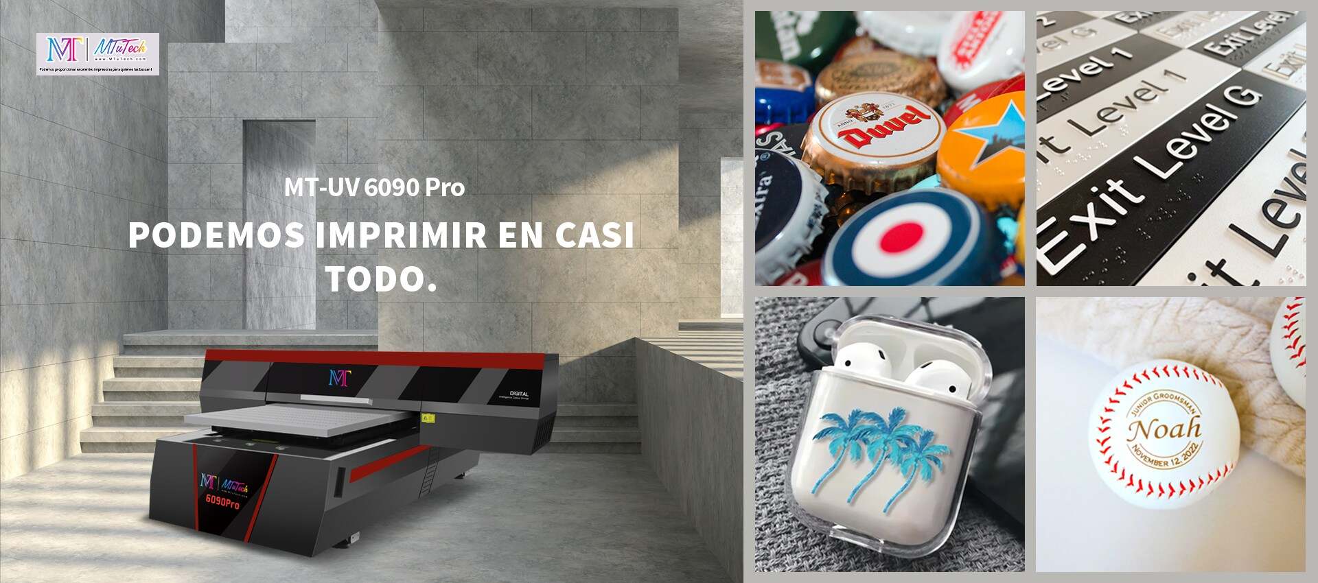 La MT-UV 6090Pro es una impresora UV de formato pequeño A1 producida por MT y tiene un tamaño de plataforma plana de 900 mm por 600 mm y una altura de impresión de 180 mm. Por esta razón, está diseñada únicamente para imprimir en objetos más pequeños.