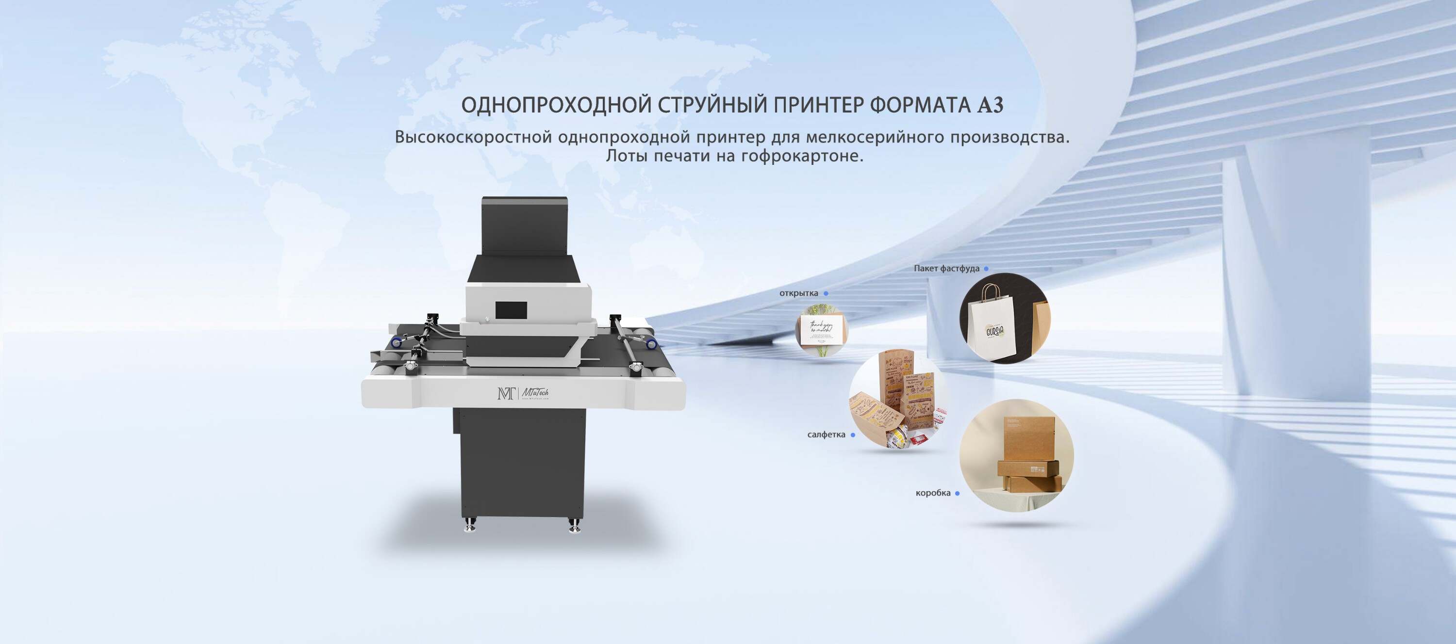 Принтер MT одинарного прохода представляет собой решение следующего поколения для прямой печати на упаковке. Независимо от ваших потребностей в печати, принтер MT одинарного прохода имеет подходящее решение для вас! Он оснащен функцией непрерывного или прерывного подачи материала, идеально подходит для печати на картонах или пористых подложках. Вы можете улучшить уже существующий бизнес в упаковочной отрасли или начать новый, воспользовавшись полным готовым решением от нас. Будь то устойчивый карточный материал, бумажные сумки, конверты, пакеты с открытым верхом, коробки, салфетки, ярлыки, подставки для стаканов, открытки, почтовые открытки или другие материалы, линейка принтеров MT одинарного прохода готова предоставить вам высокоскоростную, высококачественную, четырехцветную печать CMYK!