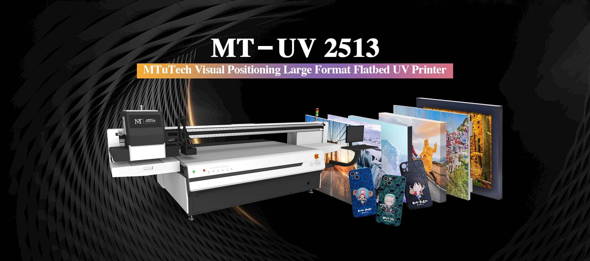 MT-UV 2513GX работает с УФ-чернилами с превосходной адгезией,который является сформулировано специально для использования на самых разных носителях, это секрет исключительной печати на любой поверхности, а также достижение высокой долговечности при использовании вне помещений. Формула чернил MT Custom UV-отверждаемых и самодельная УФ-лампа отверждения являются профессиональными в отверждении и отладке, что делает функцию отверждения безупречной. Чернила используют ультрафиолетовый свет для отверждения, сушки чернил, клея и т. д., чтобы обеспечить гладкую, идеальную отделку, которая является отличительной чертой качественных процессов печати. УФ-свет вырабатывается принтером, требуя всего лишь мгновения воздействия света для отверждения, и интегрируется в сам процесс печати.