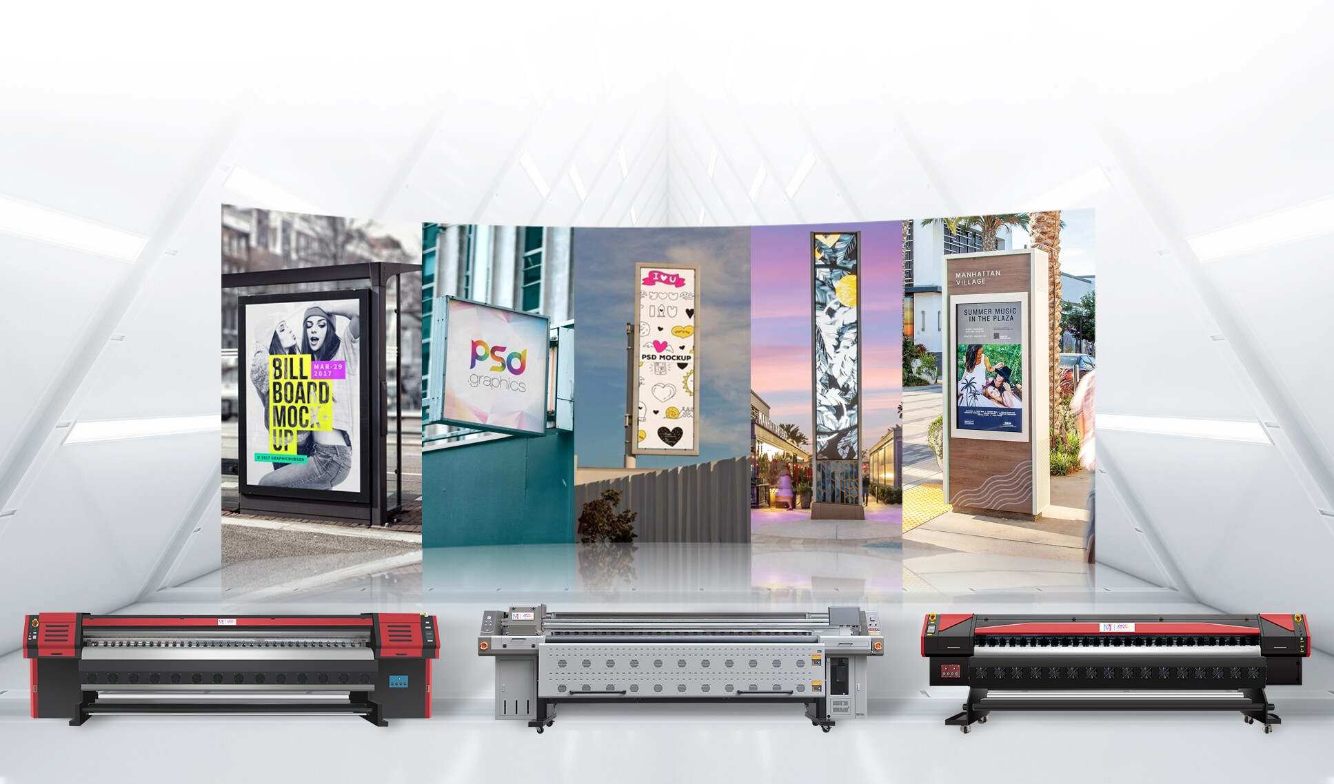 主要用于户外广告标牌印刷。可在 PVC 横幅、窗户贴膜、可印刷墙纸、可印刷地板、自粘乙烯基、软标牌、网状横幅等上印刷。